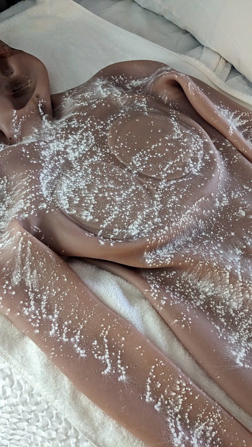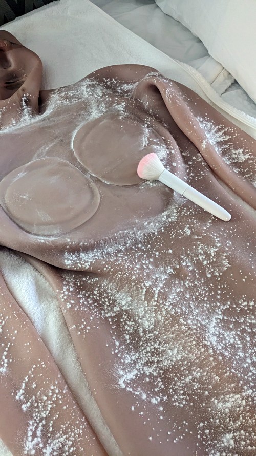 “OMG, girls are always asking me, ‘Eva, how do you get ready so fast?’ And, like, how do I do it without fearing any rips or tears? Well, let me spill the tea on the ultimate secret: powdering! 💖✨ It’s seriously the best long-term care for your silicone body, babes”